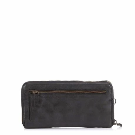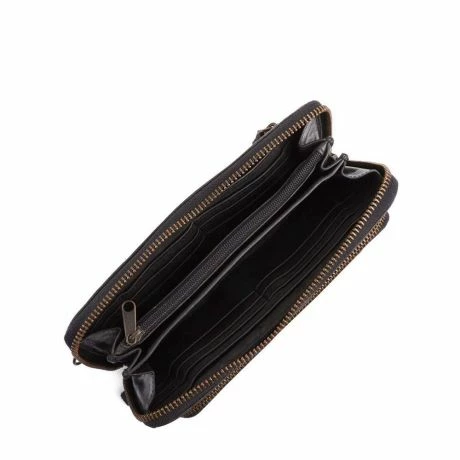 Liggend formaat met ruime indeling, voorzien van 12 kaarthouders, 3 steekvakken voor briefgeld en/of bonnetjes, en een intern ritsvak geschikt voor kleingeld. Met voorop nog een vrij ruim ritsvak voor eventuele essentiele spullen. Met polsband zodat je deze portemonnee ook als een clutch kunt gebruiken.