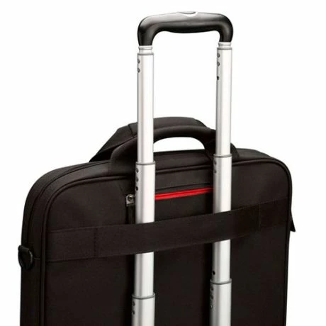 Laptoptas uit de DLC serie van Case Logic. U kunt uw 17.3″ laptop kwijt in deze veilige en stevige schoudertas. De tas bevat extra stevige dikke ritsen, zodat u de tas met gemak kunt afsluiten. Een ruim voorvak biedt ruimte voor stroomkabels en andere zakelijke of persoonlijke benodigdheden. Het voorvak is voorzien van een opbergpaneel waarin uw mobiele telefoon en zakelijke benodigdheden passen, maar ook nog genoeg ruimte biedt voor stroomkabels. De tas heeft tevens een in lengte verstelbare en afneembare schouderband om de tas op verschillende manieren te kunnen dragen. De bevestigingsband op het achterpaneel glijdt gemakkelijk over het handvat van een trolley.