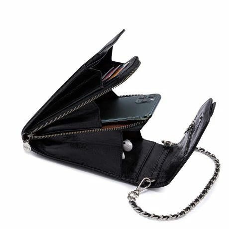 Stijlvol en praktisch telefoontasje van MÅŒSZ. De tas biedt niet alleen ruimte aan je mobiele telefoon (in alle maten) maar heeft ook 10 kaarthouders met RFID bescherming, wat het skimmen van je pasjes onmogelijk maakt. Daarnaast is er ruimte voor brief- en kleingeld, een speciaal opbergvakje voor je oordopjes en dan nog is er genoeg ruimte voor je dagelijkse ‘kleinere’ spulletjes. Het telefoontasje is op twee verschillende manieren te dragen. Crossbody dankzij de verstelbare en afneembare schouderriem en als handtas dankzij de korte schakelketting.