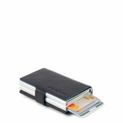 Luxe compacte portemonnee uit de Blue Square serie van Piquadro. De collectie Blue Square is gemaakt van gelooid kalfsleer. Deze traditionele looimethode behoudt de schoonheid van het leer door de jaren heen. De ruwe snijranden die met de hand beschilderd zijn, tonen het businesskarakter van de collectie en zijn een zeer herkenbaar onderscheidend element. Deze dubbele kaarthouder met uitschuif systeem heeft ruimte voor 10 pasjes in totaal en biedt bescherming tegen skimmen.