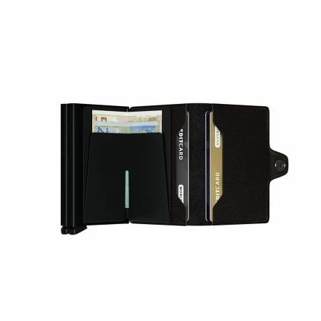 De Secrid Twinwallet bestaat uit twee cardprotectors in een leren hoes met druksluiting. Met de Twinwallet neemt u acht tot twaalf kaarten beveiligd mee. Het binnenwerk biedt daarnaast ruimte voor extra kaarten, papiergeld, bonnetjes, visitekaartjes en muntgeld. De Twinwallet is met haar 70 mm breedte en 25 mm dikte minstens de helft compacter dan een traditionele portemonnee met vergelijkbare inhoud. De twee stuks aluminium cardprotectors in de Twinwallet beschermen uw belangrijkste passen optimaal, zowel tegen buigen, slijten en breken als tegen ongewenst uitlezen van RFID-kaarten (zoals de OV-chipkaart, ID-kaart, de nieuwste creditcards en bedrijfspasjes). De Secrid Twinwallet is geschikt voor 8 tot 12 vlakke kaarten. Dankzij het unieke ontwerp schuiven de kaarten trapsgewijs naar buiten voor een eenvoudige selectie. De Secrid Twinwallet wordt geleverd in een mooie verpakking en daardoor ook zeer geschikt als uniek cadeau.